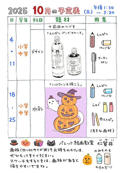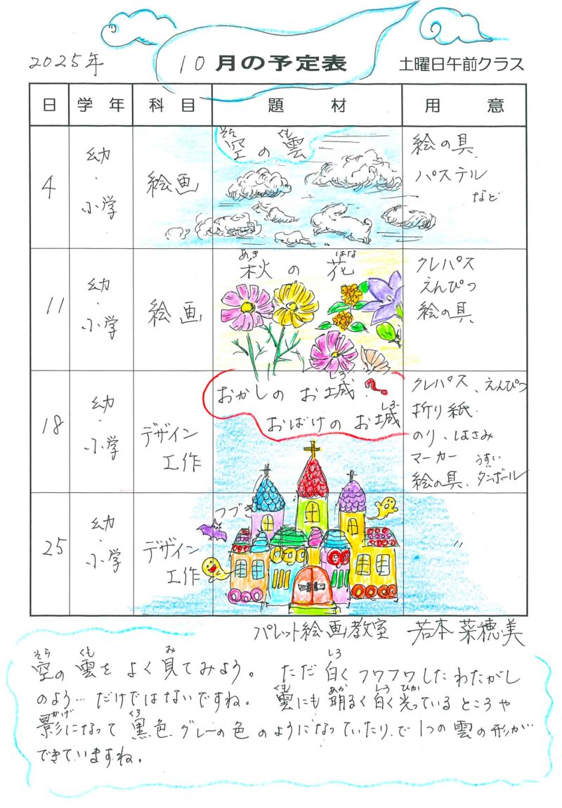2025年9月27日2025年9月27日お知らせ 10月児童画予定表 午前クラス 午後クラス 児童画午前クラスは 雲・秋の花におかしのお城・おばけのお城 10月でもまだまだ暑い日もありそうですが空を見上げるとしっかり秋の空 雲の形もかわってきました♪少しづつですが秋を感じますね午後クラスではえんぴつとペンでスケッチとハロウィン♪楽しい絵になりそうですね