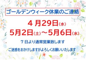 いつもお世話になっております ゴールデンウイーク休業のおしらせです
